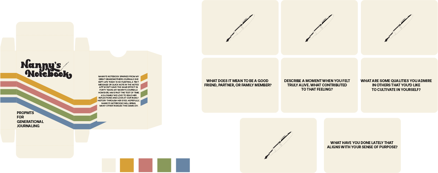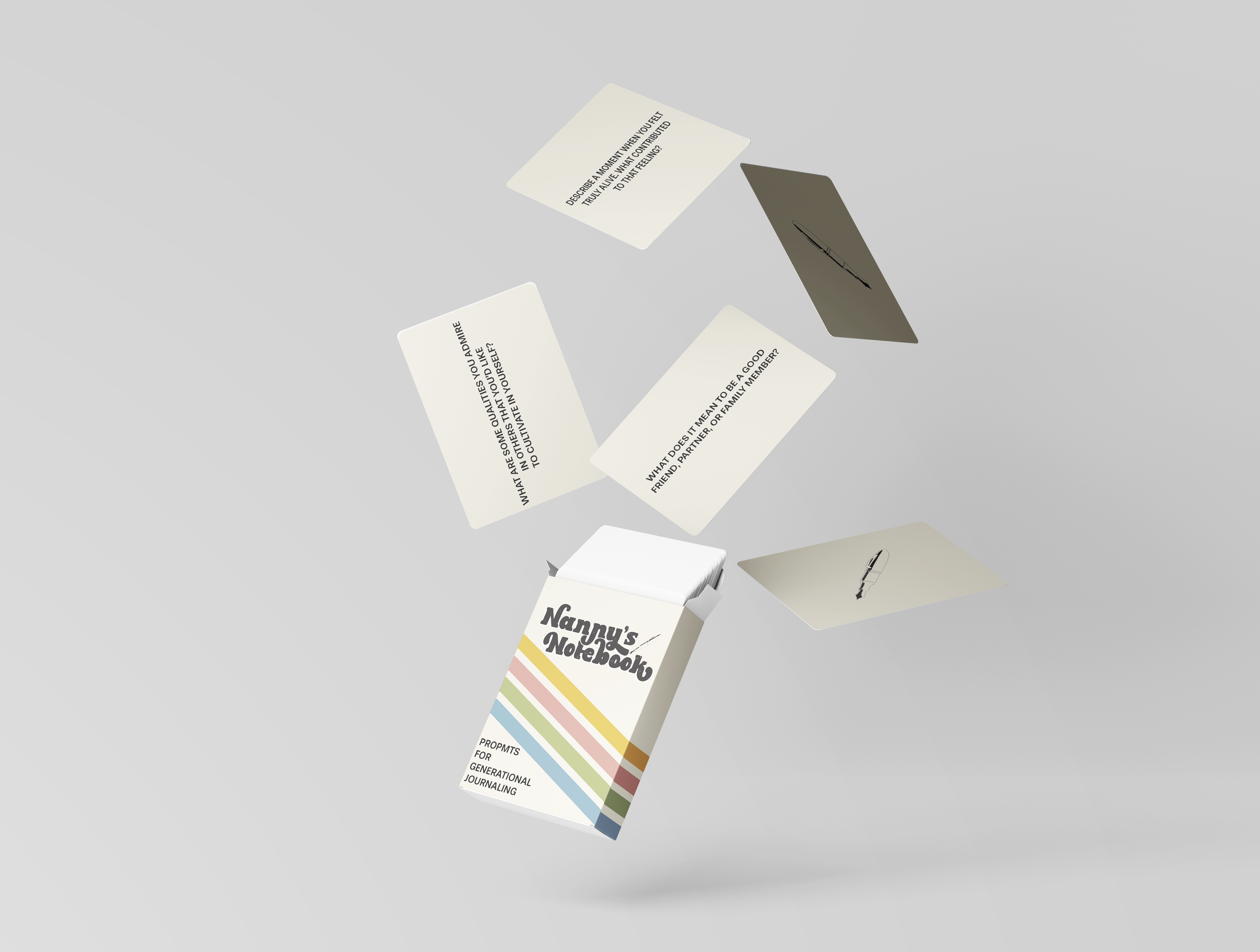 Nanny’s Notebook is a card deck designed to “package forgotten worlds.” Each card functions as a journal prompt, inviting reflection, memory, and storytelling. The project is inspired by my great-grandmother, whom I called Nanny. After she passed, she left behind a collection of handwritten journals. At every family gathering, we read one entry aloud, keeping her voice and experiences alive. This project transforms that tradition into a tactile, shared space for remembering.